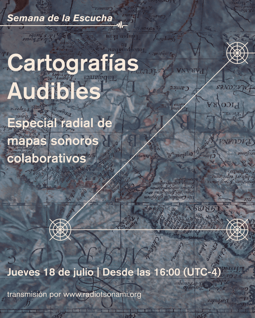 Desde las 16:00, escucha y participa a través de @radiotsonami en «Cartografías Audibles: especial radial de mapas sonoros colaborativos». Será una transmisión especial coordinada por nuestro director radial, Rodrigo Ríos Zunino. Se transmitirá por www.radiotsonami.org con la participación de los colectivos y proyectos: Audiomapa, AOIR, Proyecto Sónec, Ud. No Está Aquí, La Isla, Colectivo Austra, Mapa Sonoro XV, Acústica UACH.